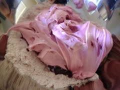In the meantime, I used a small icing spatula to lift off thin sections of the grape jelly. I placed these on one pair of the domes and piped the chocolate ganache onto the other pair of the domes.