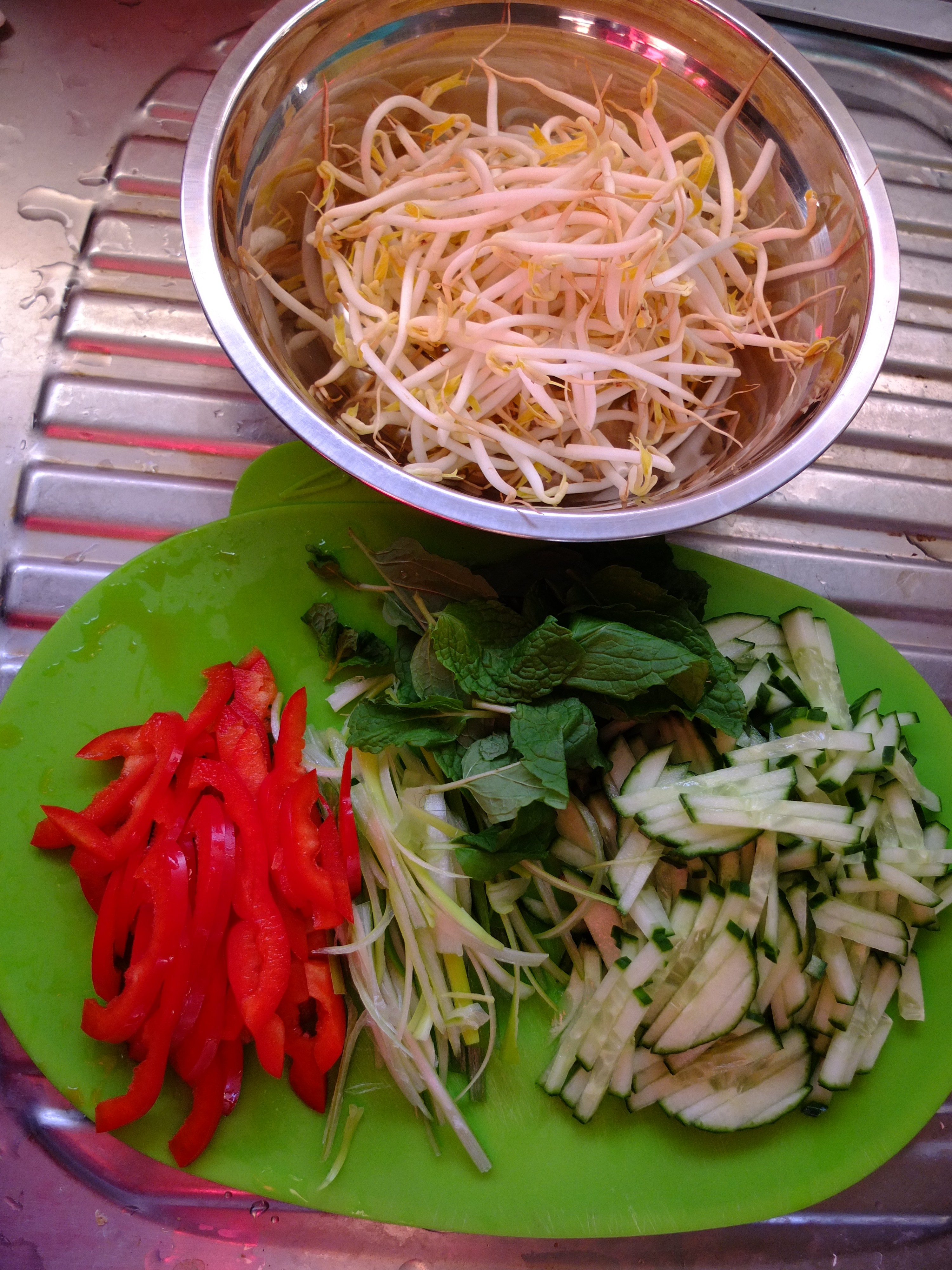 Mix the bean sprouts, cucumber, spring onions and capsicum in a bowl.