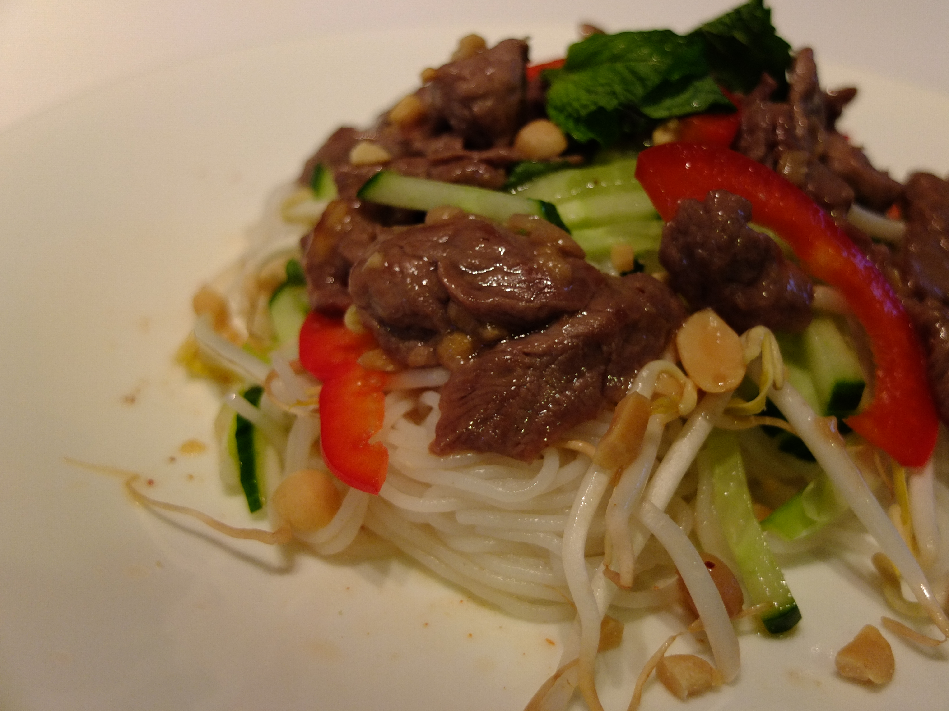 Using tongs, pick up some rice noodles and place them on the bottom of a bowl or the centre of a plate. Place a handful of the vegetables on top, add some beef slices, some freshly torn mint leaves and a sprinkle of crushed peanuts.
