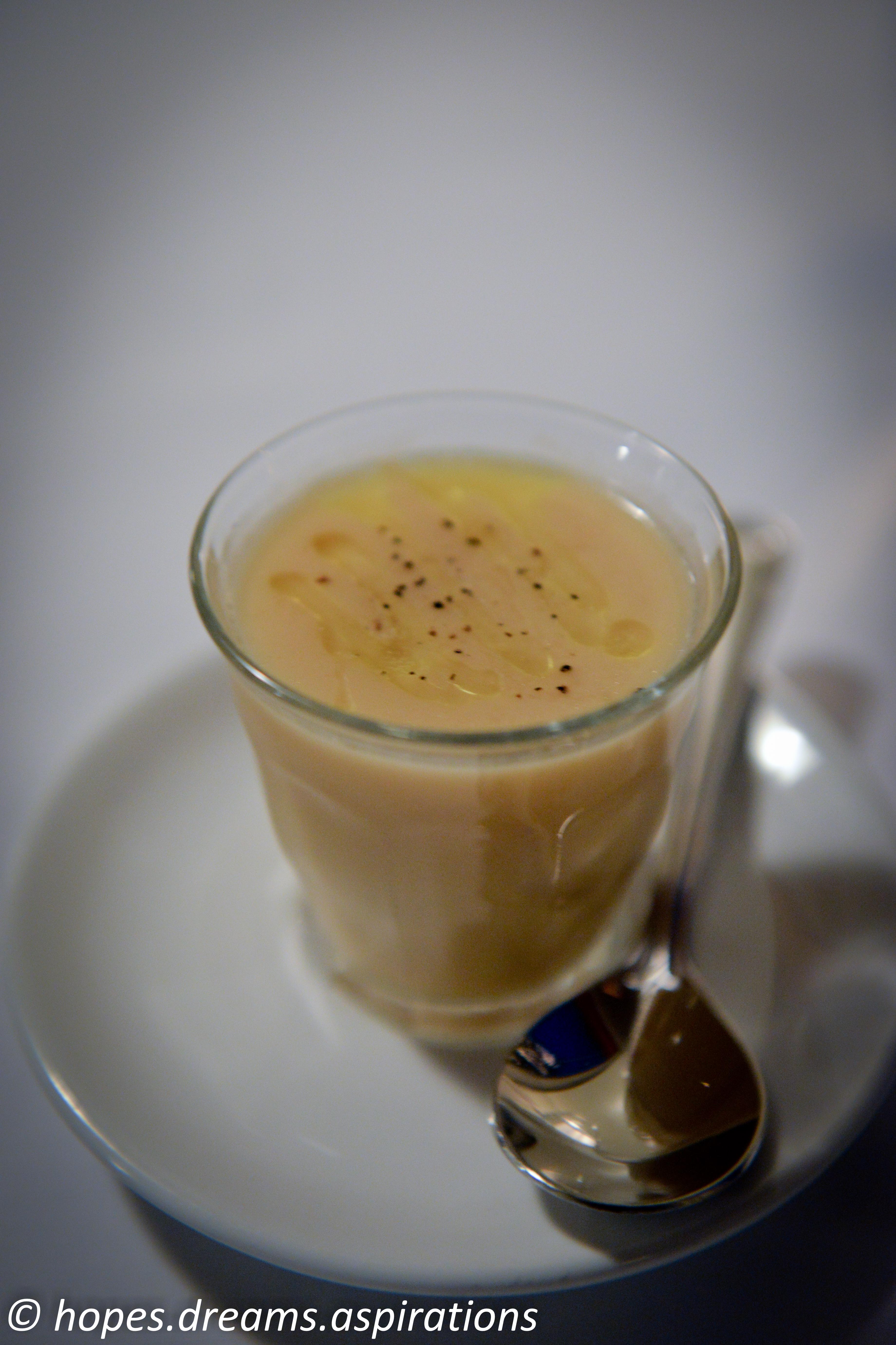 What surprised me next was that the truffle oil on top trapped the heat and it was still very hot when I finally started to eat it. The soup was extremely smooth, just thick enough and the truffle was a perfect match to the cauliflower. Hmm ideas are now flowing abound in my head over what I could do to a humble cauliflower.