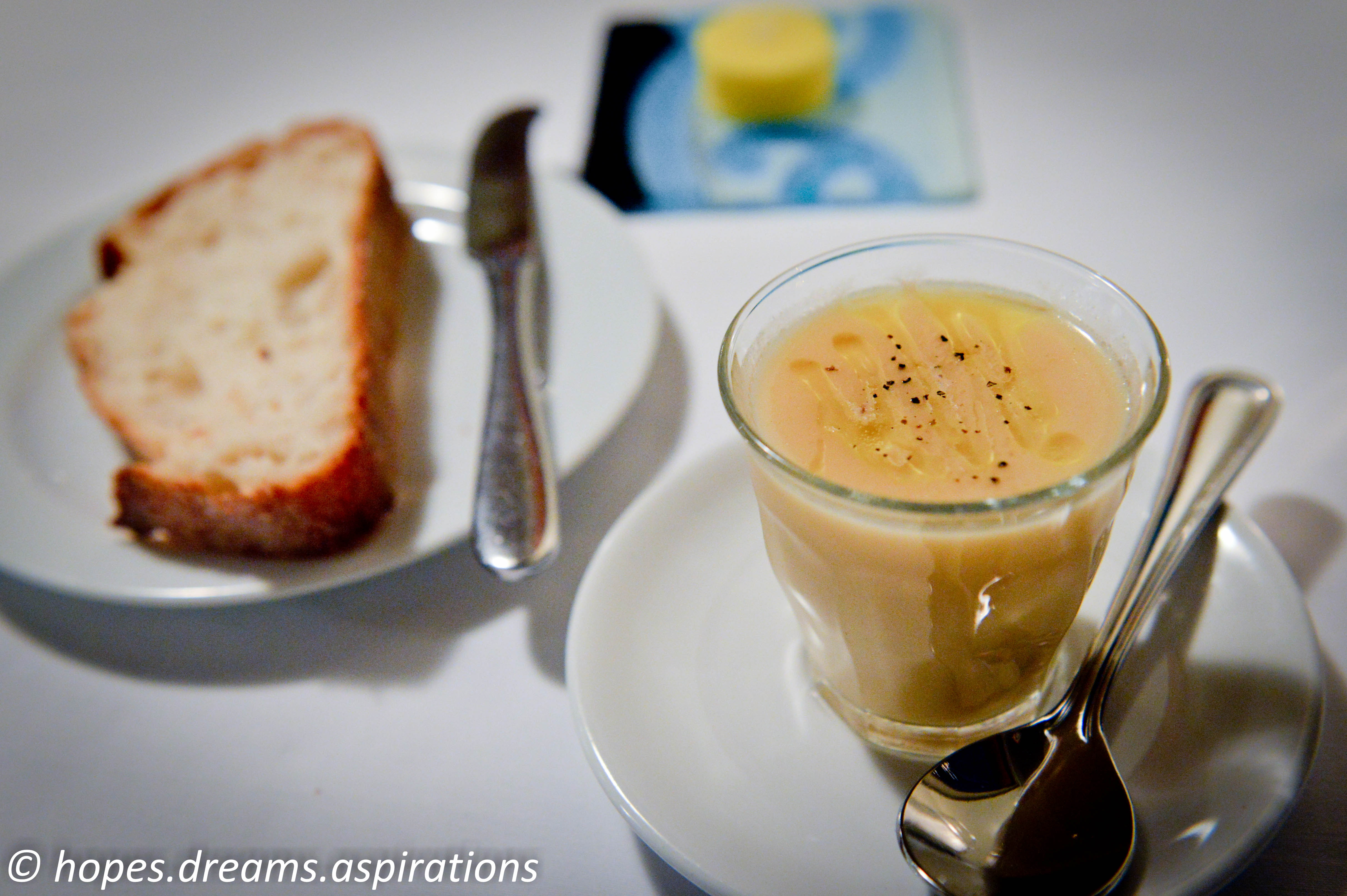 To start, I was served a warm cauliflower velouté drizzled with truffle oil and sprinkled with more truffle powder. On the side is house made bread and butter.