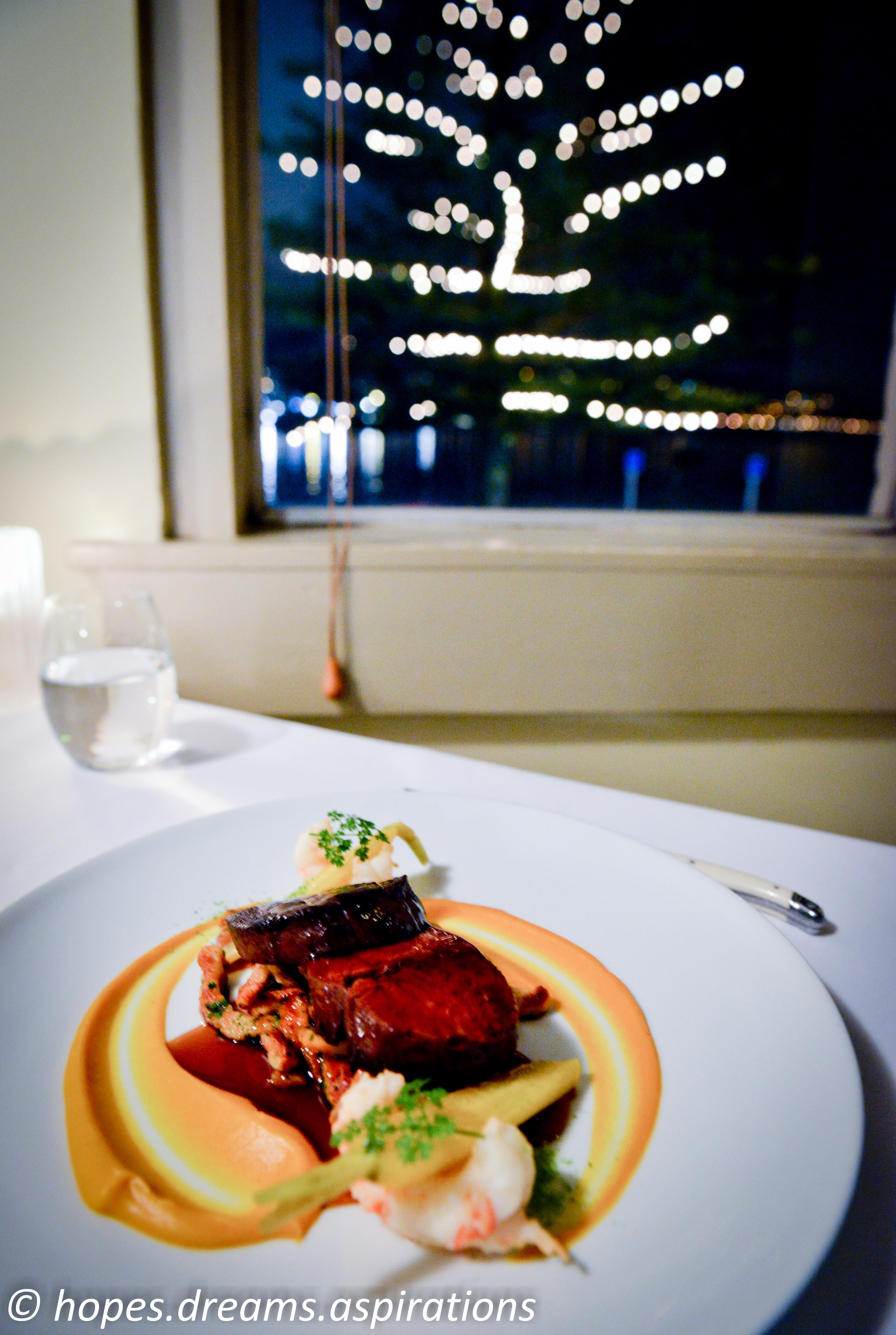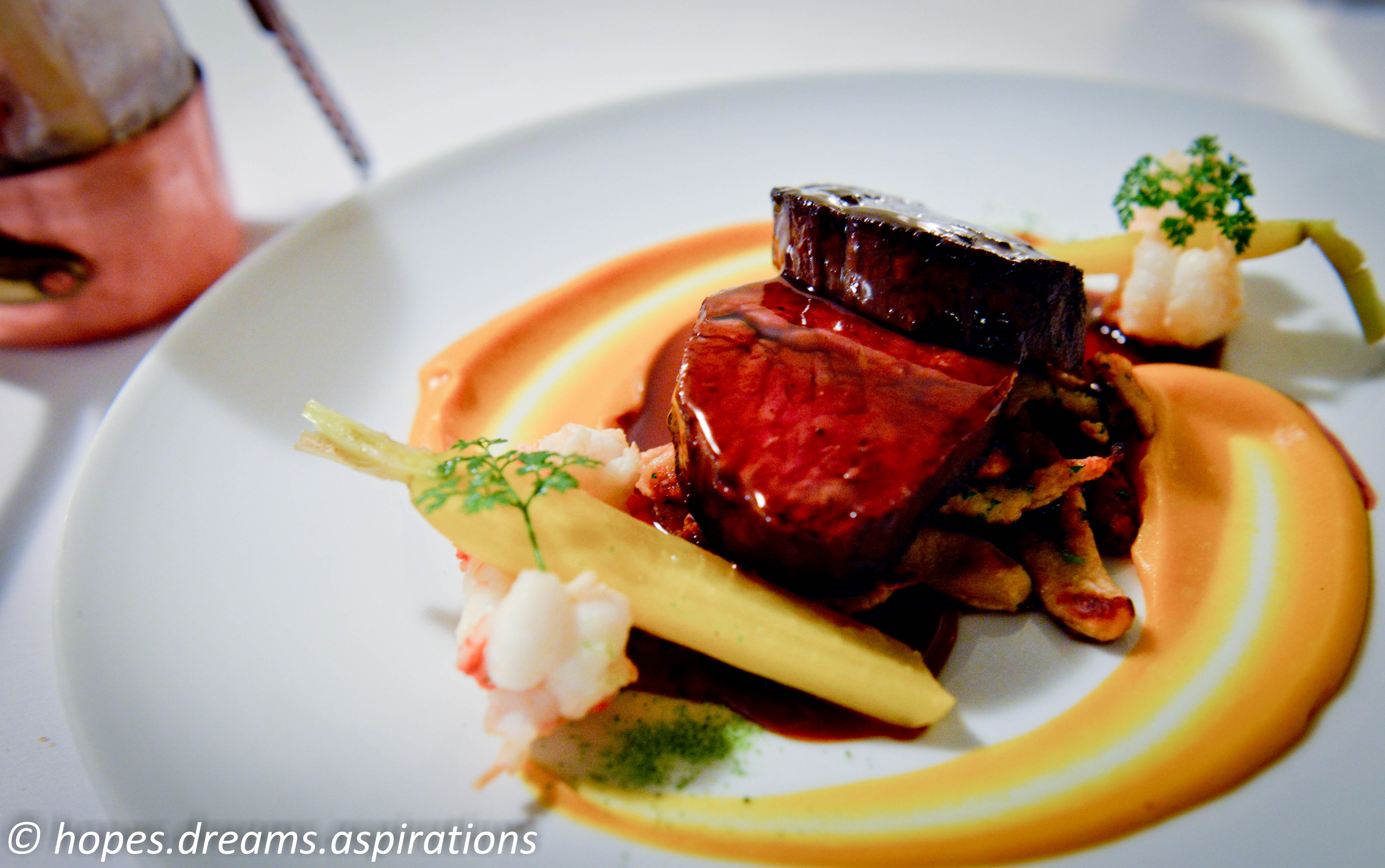 Main: Medium rare Angus pure beef fillet, fried scampi, Worcestershire spatzli, ham poached young carrots, carrot puree, oxtail juice