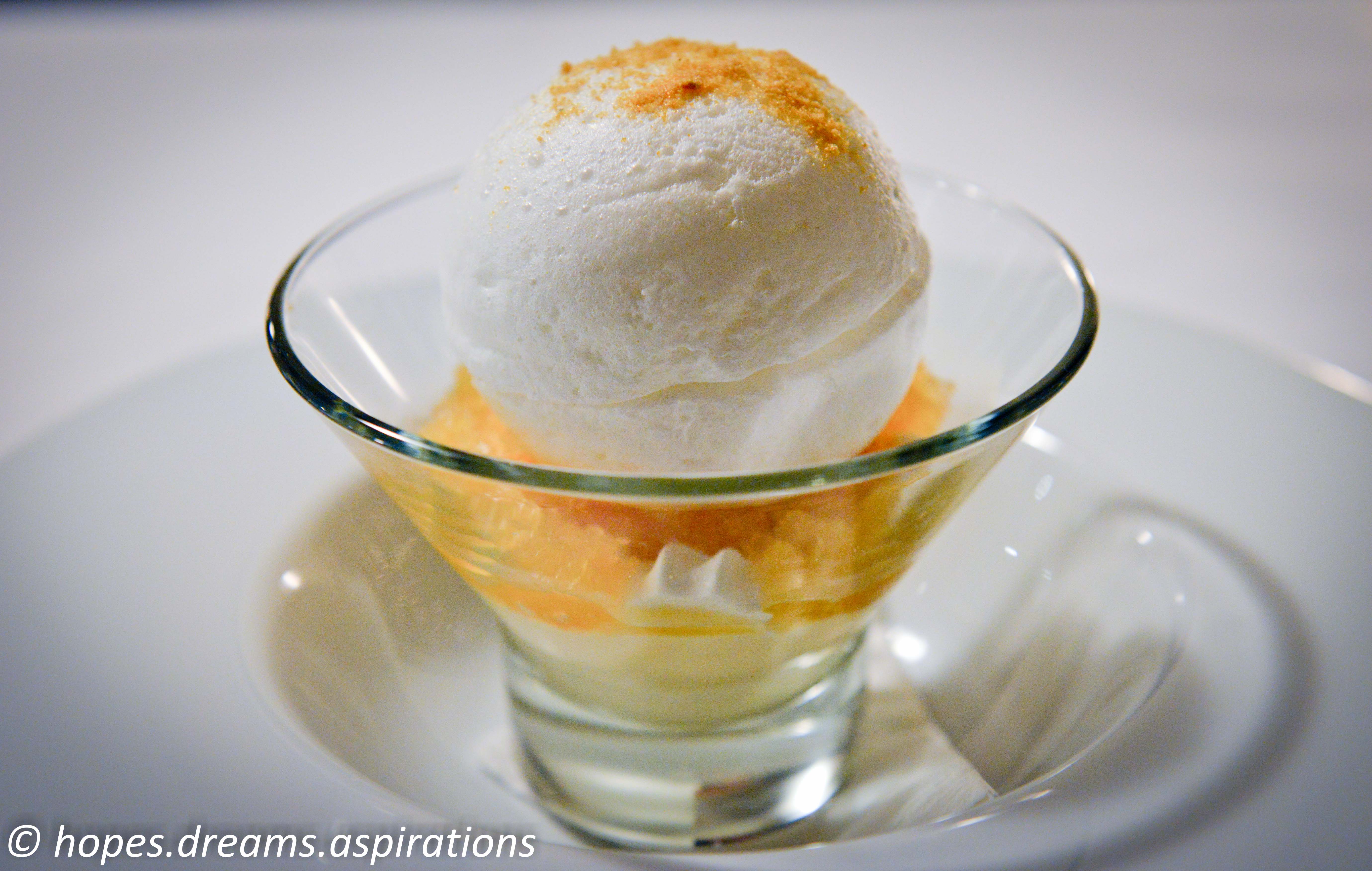 Dessert: Snow egg, passionfruit fool, meringues and passionfruit granita.
